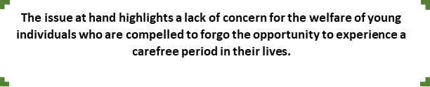 Despite the existence of legal prohibitions in all jurisdictions, the issue of child labour continues to persist as a significant challenge. Regrettably, a considerable quantity of children is engaged in hazardous occupations within sectors such as agriculture, brick kilns, carpet weaving, auto repair establishments, and private households. According to the newspaper Dawn (2022), the filing of four cases against brick kiln proprietors in Taxila ought to in still a sense of reassurance among individuals. However, it is imperative for them to exercise caution as well. One notable aspect is the recognition by authorities of the significant infringement of children’s rights to health, safety, and education, prompting their concerted efforts to identify and hold accountable those responsible (Daw, 2022). However, a considerable number of individuals have doubts about the government’s symbolic actions, such as the registration of cases, due to their extensive personal experiences and exposure to diverse circumstances. Child labour is a multifaceted matter amplified by restricted educational opportunities, inadequate legal frameworks, deficient workplace safety regulations, and various other challenges. In the meantime, the government’s insufficient financial allocation, limited resources, and inadequate management of child and social safety bureaus and departments serve as indicators of its seeming lack of concern. The issue at hand highlights a lack of concern for the welfare of young individuals who are compelled to forgo the opportunity to experience a carefree period in their lives.