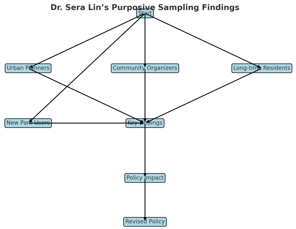 Instead of sending out random surveys to thousands, Sera used a method few understood but all respected: purposive sampling. Her logic was simple: not everyone held the keys to this mystery. To uncover the truth, she needed the puzzle solvers—urban planners who designed the policy, community organizers who protested it, long-time residents who saw the neighborhood change, and new park users whose voices were often left unheard.
